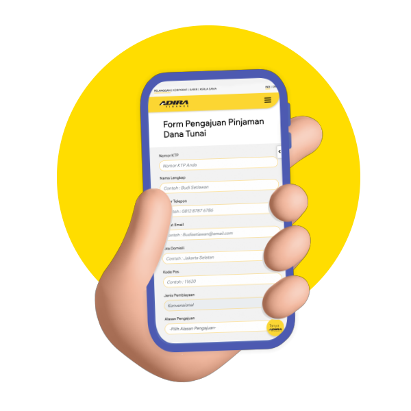 Butuh dana tunai untuk biaya modal usaha, renovasi rumah, wisata, pendidikan, kesehatan, atau perayaan, sunatan, kelahiran, dan lain sebagainya? Adira Finance menawarkan fasilitas pinjaman dengan jaminan BPKB Mobil atau Motor yang syaratnya mudah, proses pencairan dana cepat, jaringan pembayaran angsuran yang luas, pilihan perlindungan asuransi yang lengkap, sistem penyimpanan BPKB yang aman, serta layanan yang bersahabat di ratusan kantor cabang/perwakilan, call center 24 Jam.