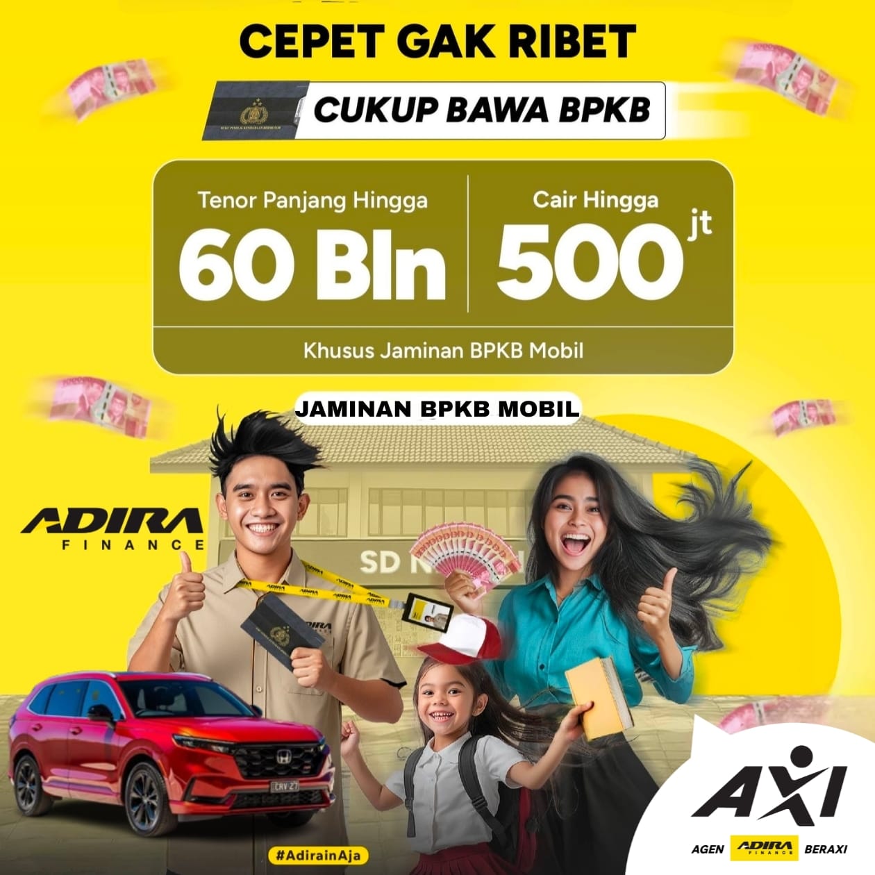 Butuh dana tunai untuk biaya modal usaha, renovasi rumah, wisata, pendidikan, kesehatan, atau perayaan, sunatan, kelahiran, dan lain sebagainya? Adira Finance menawarkan fasilitas pinjaman dengan jaminan BPKB Mobil yang syaratnya mudah, proses pencairan dana cepat, jaringan pembayaran angsuran yang luas, pilihan perlindungan asuransi yang lengkap, sistem penyimpanan BPKB yang aman, serta layanan yang bersahabat di ratusan kantor cabang/perwakilan, call center 24 Jam.